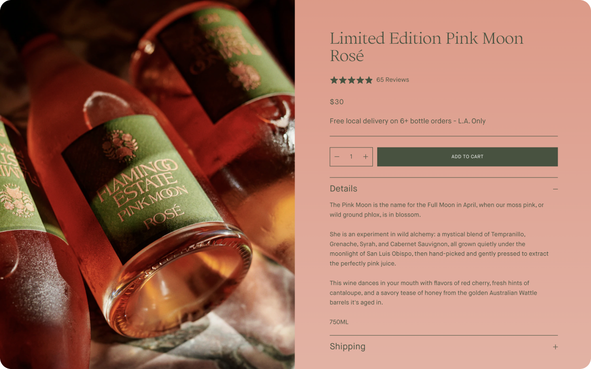We worked with the team at Flamingo Estate to launch Pink Moon Rosé in the Summer of 2021. Pink Moon required a fast development schedule on the Shopify Plus platform. Care was taken to ensure a seamless and unique user experience for users entering from the Flamingo Estate main website into this micro-site.